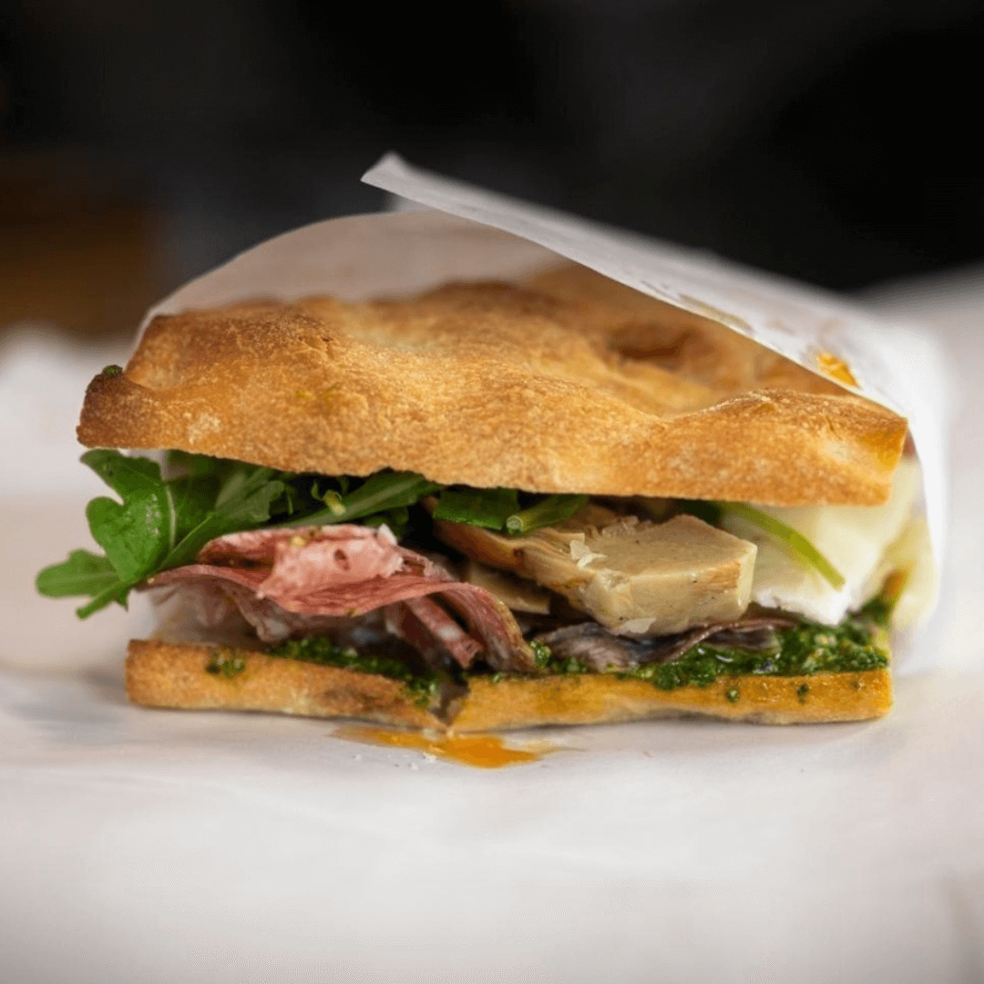Herbed porchetta and truffle gorgonzola with briny olives, sweet onion, arugula and bright lemon oil. rich and addictive.